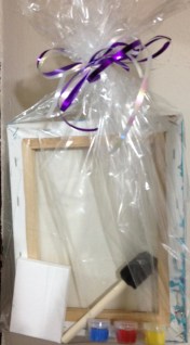 Step 2: After you finish your painting and it has dried, you are ready to put your kit together! Put the blank canvas, paint and paint brush you are giving away on the back side of your painting.