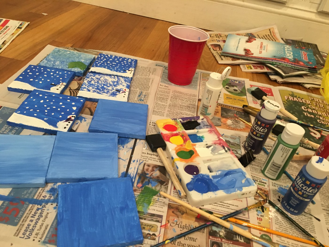 We are well underway on making our November Donation this Saturday, November 26th. These are the 3×3 canvases in mini bags with a paint brush and a paint palette that we are donating.