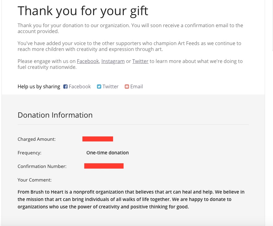 For our May Donation, From Brush to Heart donated to Art Feeds, an organization whose mission is to, “feed creative development and facilitate emotional expression in children through art and community.” Their mission is inspiring and enlightening, and we are happy to have been able to aid in their cause.