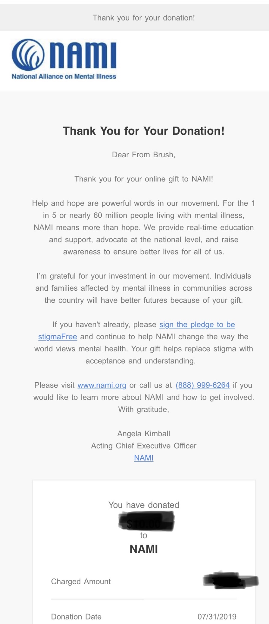 To celebrate mental health and the importance of it, From Brush to Heart has donated to NAMI, the National Alliance on Mental Illness. NAMI education, advocacy, and support for those struggling with mental illness. If you find your self struggling, or if you would just like someone to talk to, we implore you to visit NAMI’s website: http://www.nami.org or call 888-999-6264.